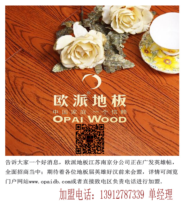 告訴大家一個好消息,歐派地板江蘇南京分公司正在廣發(fā)英雄帖,全面招商當中;期待著各位地板屆英雄好漢前來會盟,詳情可瀏覽門戶網站或者直接致電區(qū)負責電話進行加盟,加盟電話:13912787339 單經理